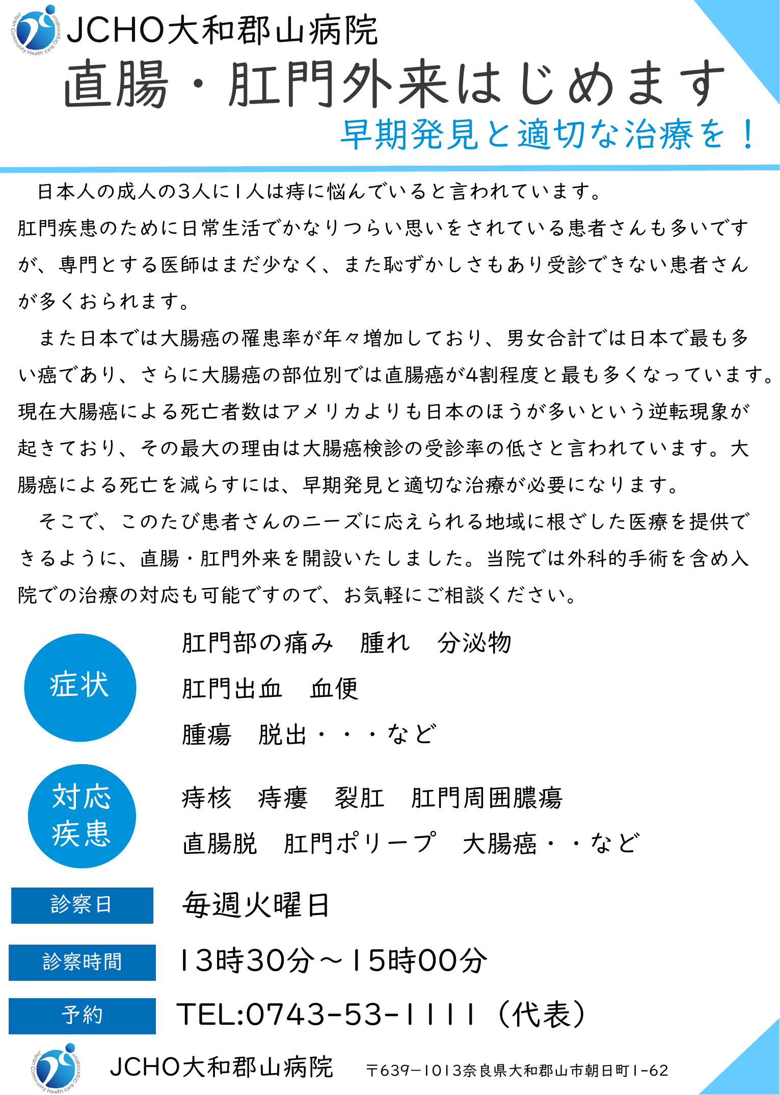 このたび患者さんのニーズに応えられる地域に根ざした医療を提供できるように、直腸肛門外来を開設いたしました。一般的には肛門疾患は外来治療を行うことが多いですが、当院では外科的手術を含め入院での治療の対応も可能ですので、お気軽にご相談ください。